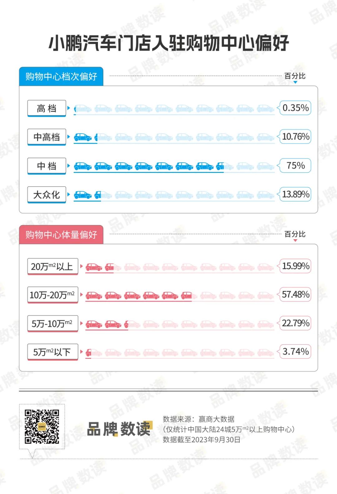 为了达到品牌宣传效果,加上产品进场受限,新能源汽车门店通常在购物中心一楼的大店。以小鹏汽车门店为例,其主要选择5万平米以上的购物中心入驻,其中超过八成门店都在5万-20万平米的购物中心中。