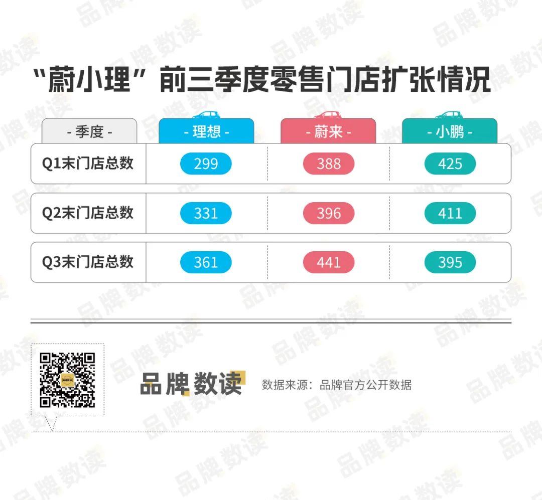 品牌数读梳理的数据显示,今年第三季度,理想净增30家零售门店,蔚来净增45家,小鹏门店依旧在收缩,净减少16家,门店数量从第一季度末的425家缩减至395家。