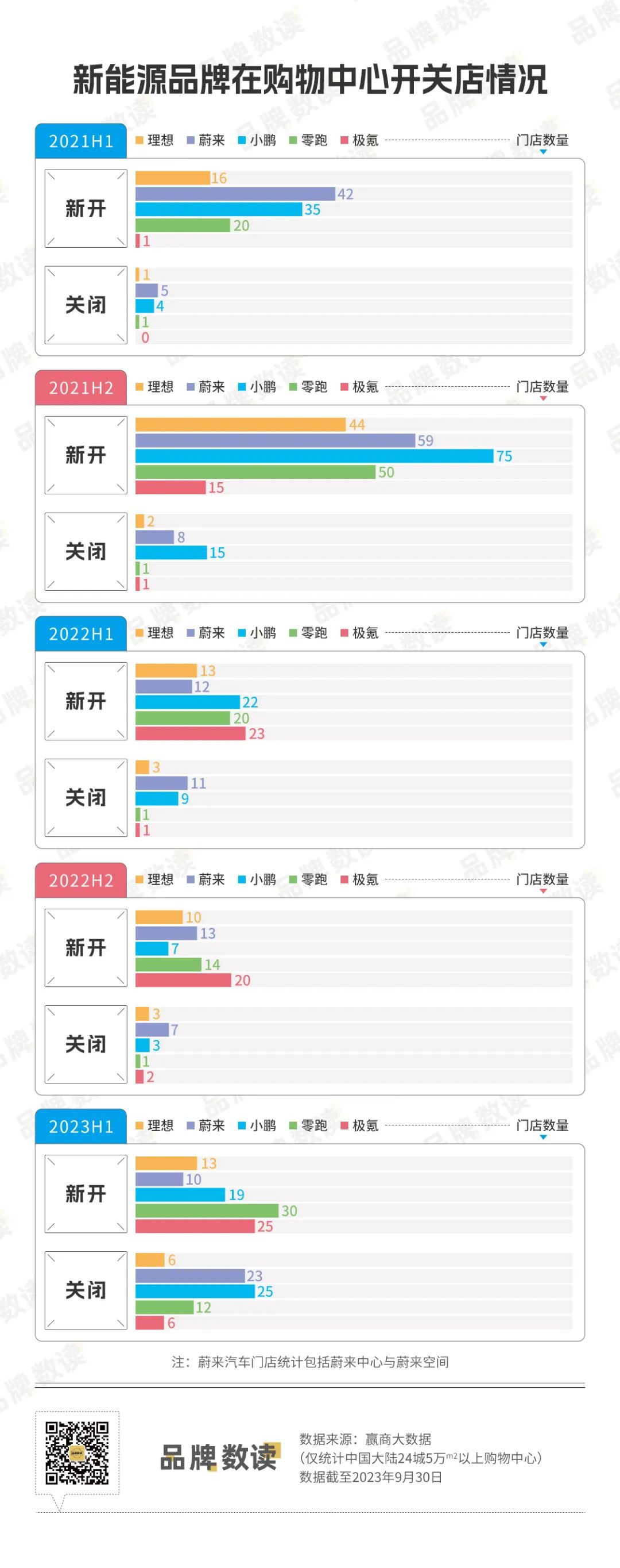 赢商大数据显示,2023年上半年,蔚来和小鹏汽车在购物中心门店数量已经呈现出负增长状态。其中,蔚来仅新开10家门店,关闭23家门店,净减少13家;小鹏汽车新开19家,关闭25家,净减少6家门店。