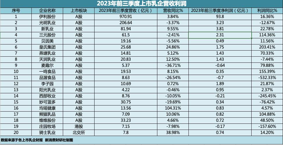 先看各大乳企前三季度营收和净利润的表现和增长情况。