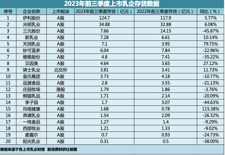 根据企业财报和公开数据,新消费财研社盘点乳企存货数据如下。