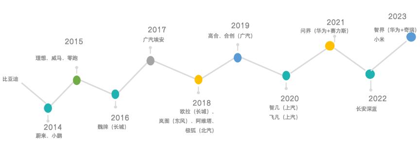 如果把2014年作为分水岭,会发现,新势力造车企业出现之后,广汽、长城、上汽、长安,几乎国内所有的传统车企都陆续推出电车品牌,走的基本都是豪华高端的路线。大家的目的都很一致,在一个还没有第一品牌的赛道里,打定位战。