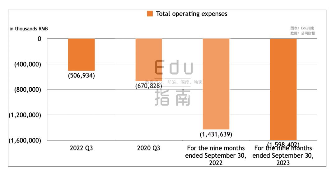 根据季报,高途公司本财年Q3总经营费用为6.7亿元,同比上一财年Q3的5.1亿元,该费用增幅为32.3%。前三季度该公司总经营费用为16.0亿元,相较上一财年同期的14.3亿元,该费用增幅为11.6%。