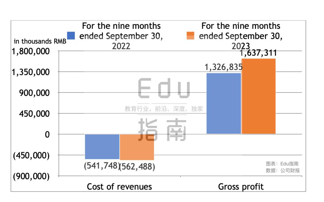 本财年前三季度高途公司收入成本为5.6亿元,相较上一财年同期的5.4亿元,该期收入成本增幅为3.8%。前三季度该公司毛利为16.4亿元,相较上一财年同期的13.3亿元,该期毛利增幅为23.4%。