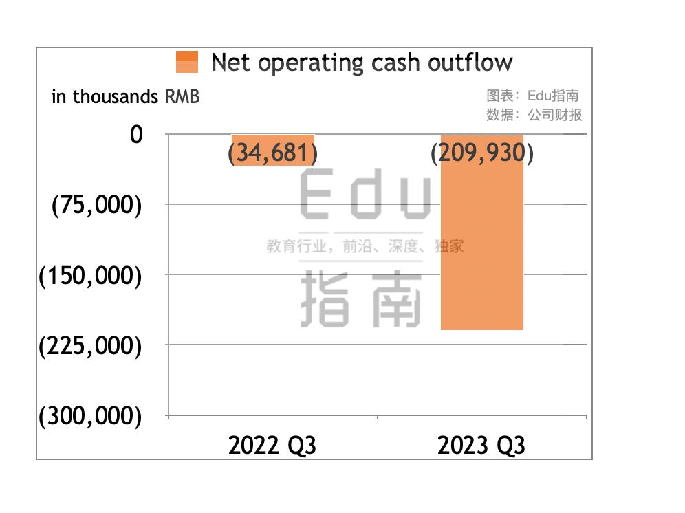 根据季报,本季度高途公司经营现金净流出额为2.1亿元,上一财年同期该项净流出额为3468万元,本季度经营现金流出额有所增加。季报称,2023年第三季度经营现金流净流出增加,主要是由于劳动力支出增加以及营销和品牌活动支出增加。