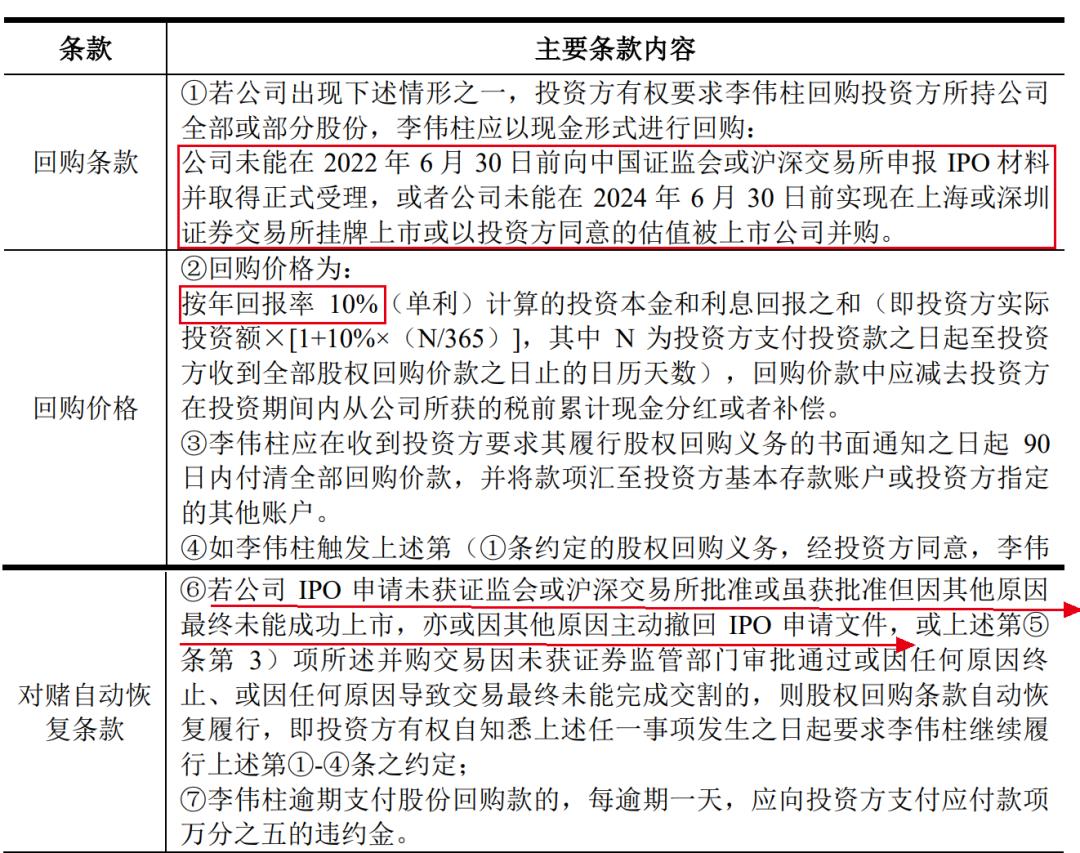 按照规定,公司未能在2024年6月30日前实现在上海或深圳证券交易所挂牌上市或以投资方同意的估值被上市公司并购;或因其他原因主动撤回IPO申请文件等情形出现时,李伟柱需现金回购投资者全部或部分股权,并按10%年利率计息。