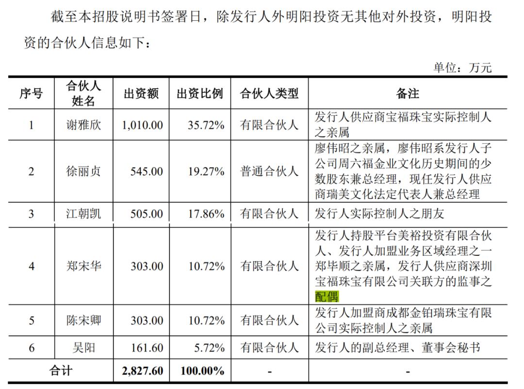 「子弹财经」注意到,明阳投资合伙人共有6位,其中,谢雅欣、徐丽贞、郑宋华、陈宋卿、江朝凯或其家族成员是李伟柱多年好友,吴阳则是公司董秘、副总经理。
