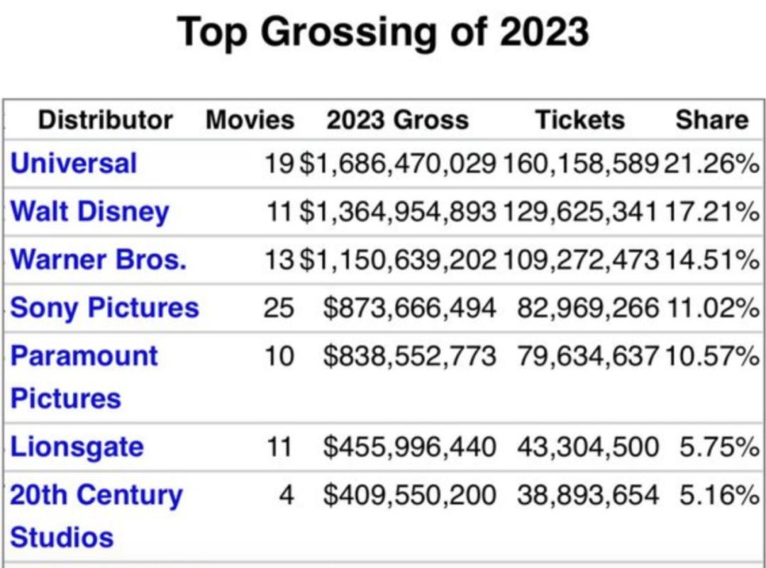 (2023年好莱坞各大厂牌票房排名)
