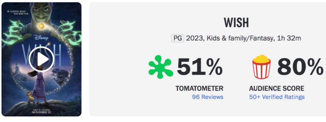 因此,即将上映的迪士尼本部动画《星愿》,无疑承载着接下来的回暖重任。可是就目前的风评来看,可能《星愿》并不是那个让迪士尼重回巅峰的作品,目前影片北美烂番茄仅有51%而已,显然这跟迪士尼出品是不匹配的,要知道迪士尼本部动画翻车的情况是很少的。