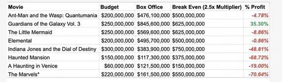 以上便是迪士尼电影今年的表现。从列表中可以看出,仅有《银河护卫队3》实现了盈利,包括像《蚁人3》、《惊奇队长2》这种漫威系列都迎来了亏损,尤其是后者,简直就是灾难,要知道曾经的《惊奇队长》可是2019年的超级大爆款。