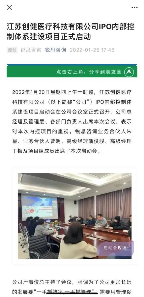 早在2022年1月25日,国内风险管理咨询服务机构锐思咨询在其官方微信发布文章称,2022年1月20号创健医疗IPO内部控制体系建设项目启动会正式召开,启动仪式上,钱松做了启动发言,多次强调执行的重要性,不可让内控工作流于形式。