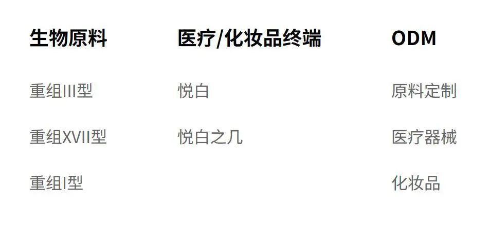在业务层面,公司原料、产品、代工三步走,具体包括原料业务、医疗/化妆品终端产品业务以及ODM代工业务。(编者按:ODM即原始设计制造商,由采购方委托制造方提供从研发、设计到生产、后期维护的全部服务,采购方则负责销售。)