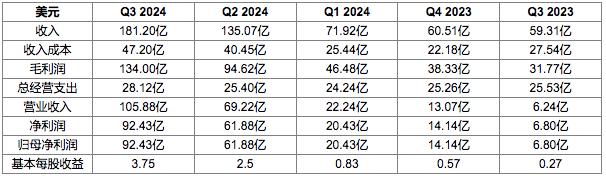 11月22日早间,英伟达发布2024财年第三财季财报(截至自然年2023年10月29日),期内实现收入181.2亿美元,同比上涨206%,远高于市场预期的162亿美元,创纪录新高;净利润92.4亿美元,高于市场预期的72亿美元,而去年同期利润仅6.8亿美元。