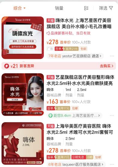 在电商平台搜索这些热门的轻医美项目,你会发现“美貌”的成本好像真的在变低: