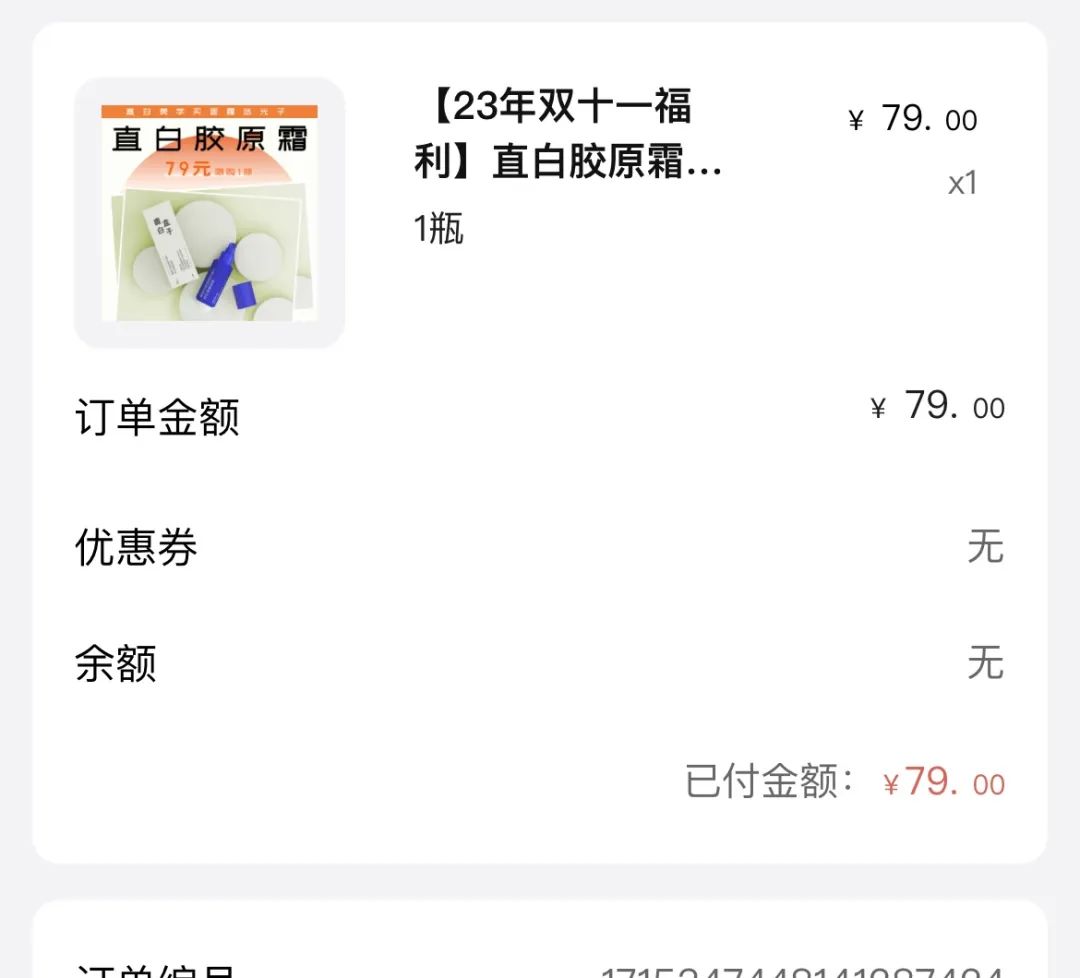 在医美项目上的“投资”,基本已经成为她在购物节期间的唯一花销,因为价格确实合算。今年,她薅到的最大羊毛,是在某微信小程序上抢到的“买面霜送光子(嫩肤)”套餐,该活动只要79元,就能获得一款修复面霜,还能在线下享受原价大几百元的光子嫩肤。