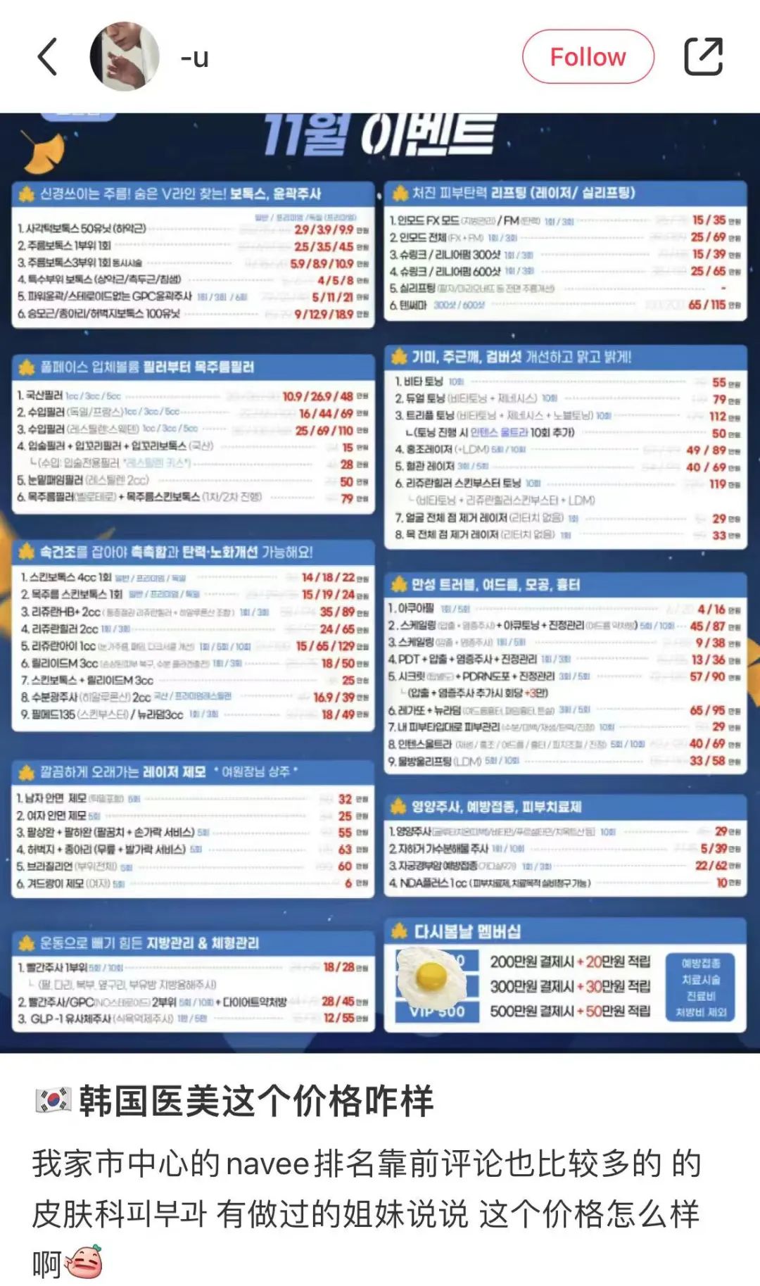 在一些社交媒体上po出的韩国医美价格,机构在收费方面也相对透明。(图/小红书@-u)