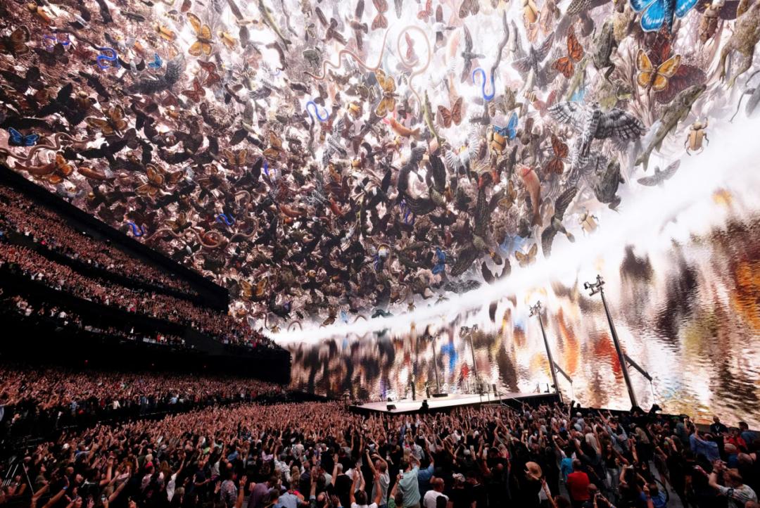随着压轴曲目《Beautiful Day》响起,头顶的巨大环型屏幕瞬间变亮,成千上万只动物在头顶伴随着圣光出现,彷佛《圣 经》里万物重生的场面,又好像是文艺复兴时期的巨匠再生,用电子笔触画下赛博教堂穹顶。