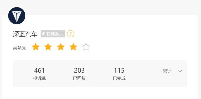 黑猫投诉数据显示,深蓝汽车累计投诉量为461,已回复为203,已完成115,依然有大量投诉尚未达到回复和解决。