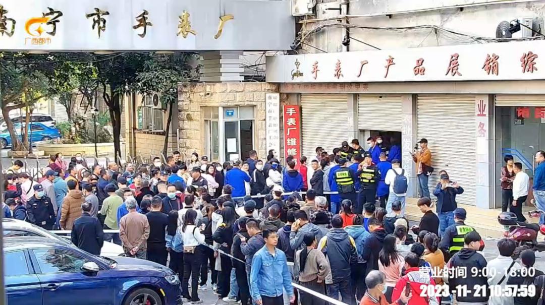 来自各地的消费者在古朴的玻璃柜台前排起长龙,甚至有人等了十小时,就为了抢购一块南宁手表厂上世纪的王牌产品,“桂花牌”手表。