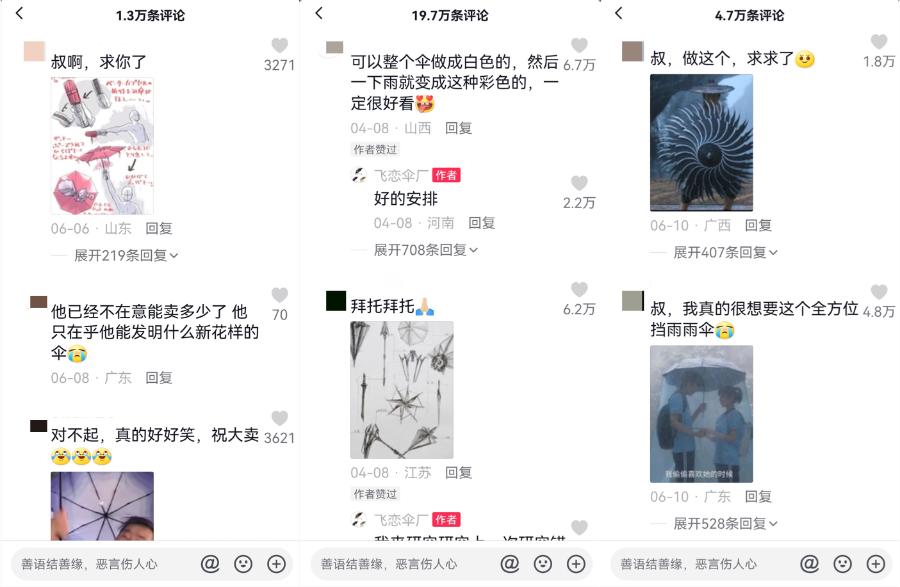 来自绍兴的雨伞品牌飞恋伞厂,一度因为外贸出口受创滞销。为了找活路,老板雷鹏琳做起了抖音博主,整活制作“镭射反光伞”“吾皇伞”“全身伞”等脑洞大开的奇葩伞具。