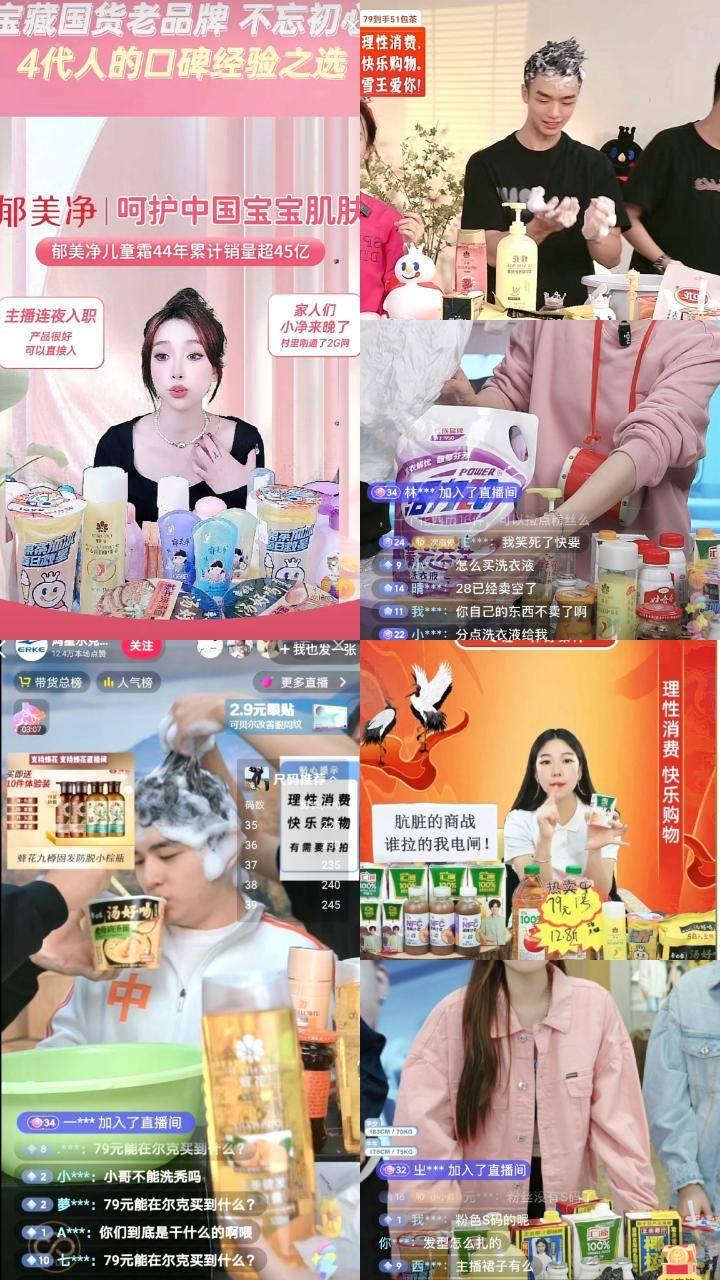 随后整活进入高潮,郁美净加入了和蜂花、鸿星尔克、莲花味精等国产品牌的联动,把抖音直播间做成连续剧。