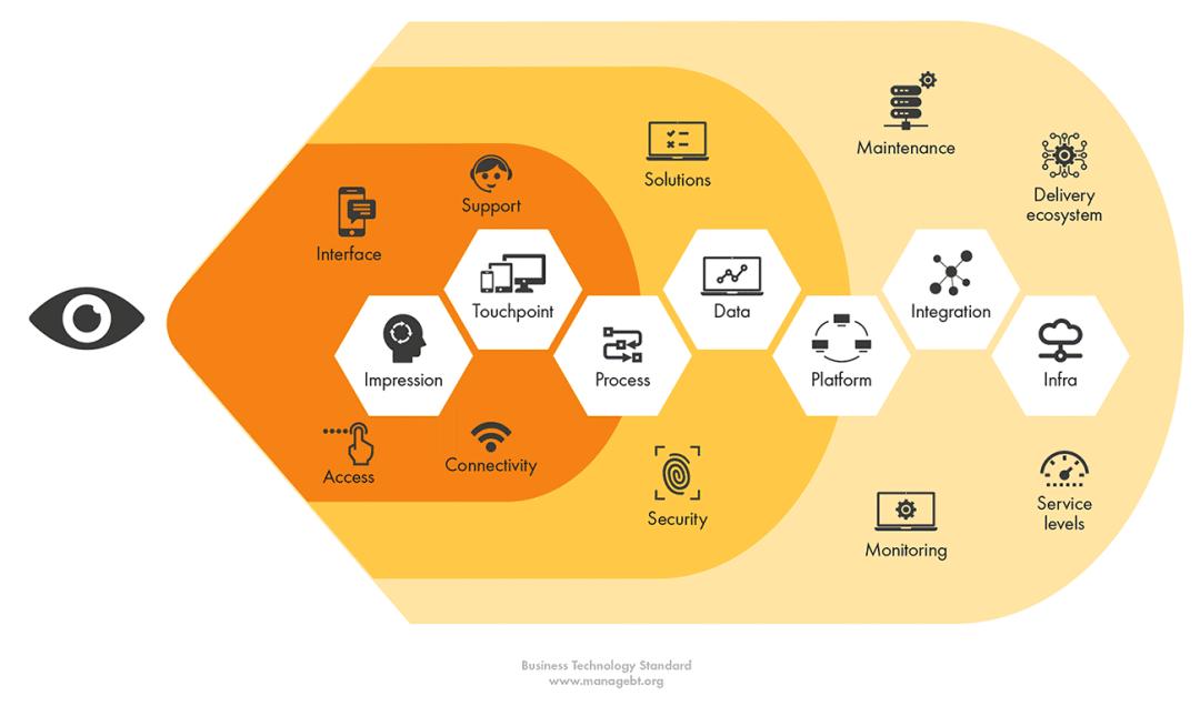 商业技术服务消费者获得印象和接触点,以访问包含底层平台、集成和基础设施的流程、应用程序和数据。如果这些组件中的任何一个出现故障,整个服务就会失败。因此,即使服务消费者通常只感知到服务的具体结果,服务的管理也是必不可少的。