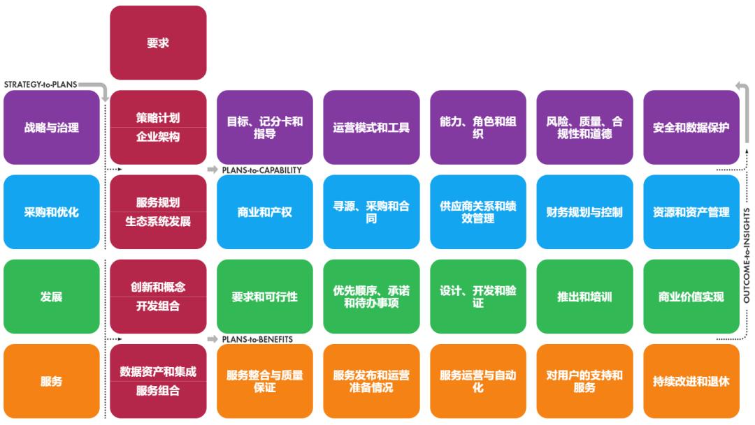 业务与技术协同的能力框架包括需求、战略和治理、采购和优化、开发和服务五个部分,如下所示。下满我们就针对每一步分做简要介绍。