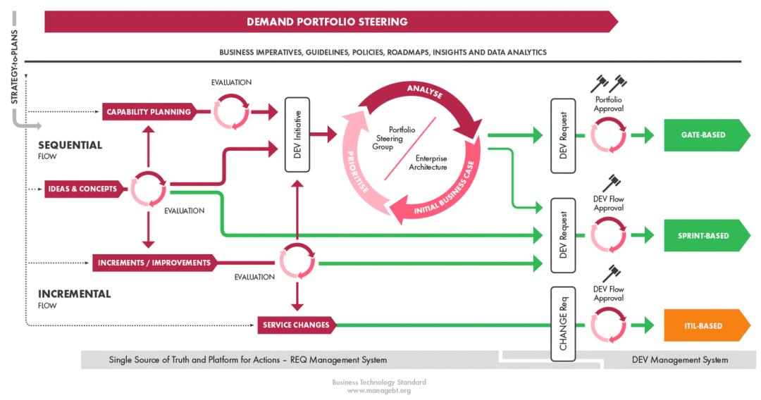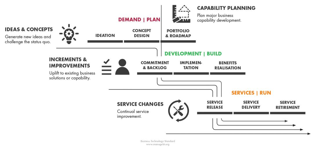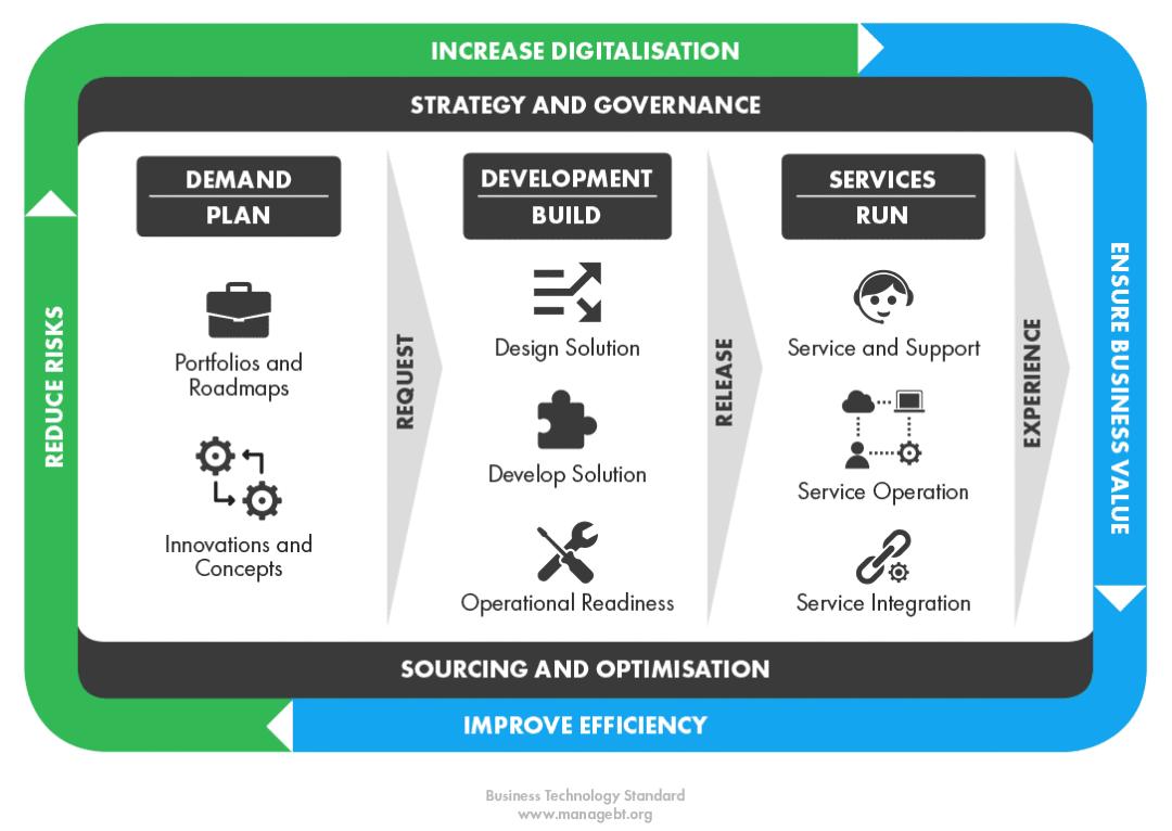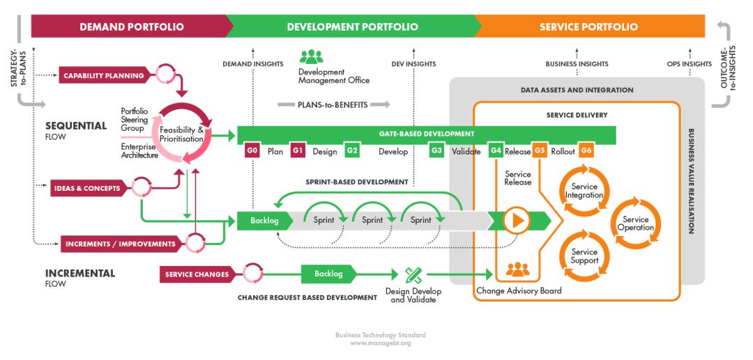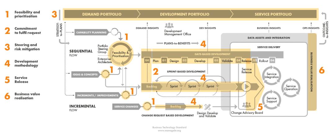 业务技术标准提供了一个务实且以业务为中心的参考模型,支持开发实践的采用。该标准可以灵活地与所有成熟度级别的组织一起发展,并且可以集成大规模敏捷框架和DevOps等实践。开发实践的一些示例是: