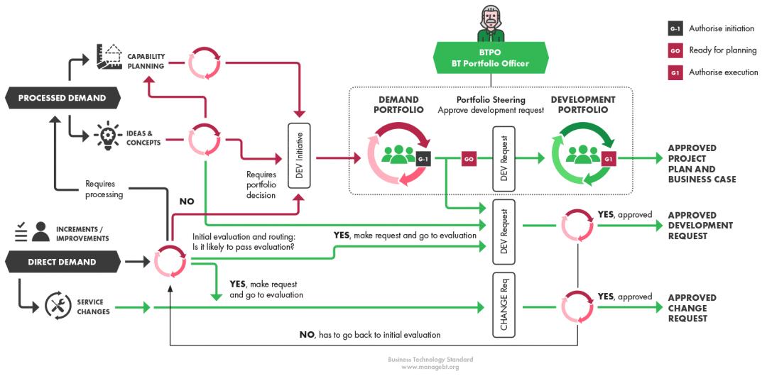 需求领域与其他四个领域交叉,其主要目标是将业务要求转化为具体的业务技术行动。执行主要通过管理两个流程来完成:策略到计划和需求到请求。