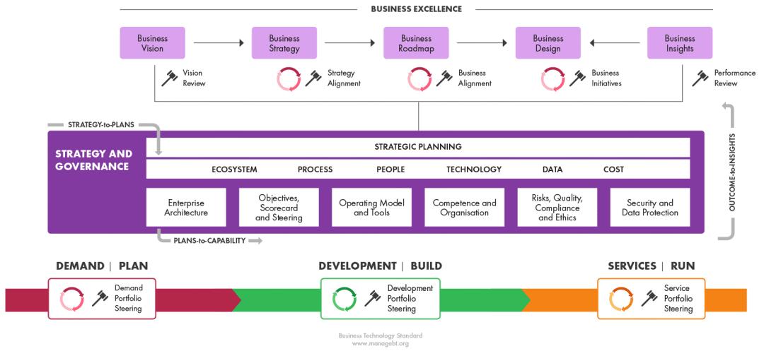 战略和治理旨在通过定义指导方针、规则和框架来优化业务技术职能的工作方式。战略和治理的职责涵盖以下三个主要主题: