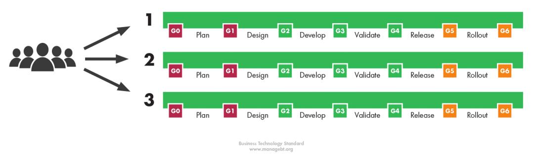 共享资源团队在业务部门/职能之间分配一部分专用容量,并可以根据主要开发请求按需扩展大量资源。由于开发请求通常超出共享团队的处理能力,因此资源的优先级是集中处理的。这可能会减慢上市时间,但可以确保将必要的资源分配给优先开发主题。这种方法通常与顺序开发相关。