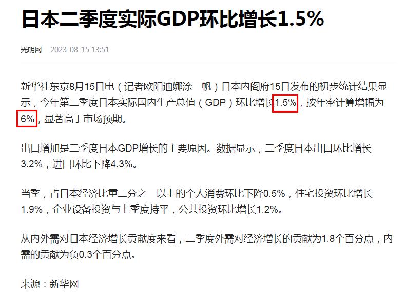 今年8月中旬,日本公布了二季度GDP数据,环比增长1.5%,按年率计算增幅为6%。