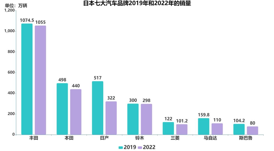 以日本最核心的产业汽车为例,我们把日本七大汽车品牌2019年和2022年的数据进行对比,就会发现其中的问题。
