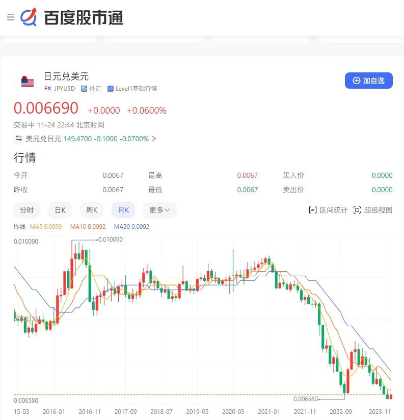 近几年日元兑美元汇率的走势 图源:百度股市通