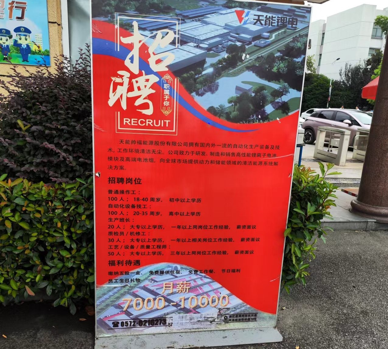天能股份厂区门口的招聘启示 图片来源:36氪拍摄
