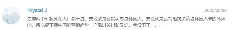 在聚美丽《LG生活健康美容业务Q1卖36.24亿,中国市场下跌14.1%》一文的评论区中,曾有不具名两大韩妆企业前员工透露,不懂中国营销趋势是韩妆没落的一大原因。