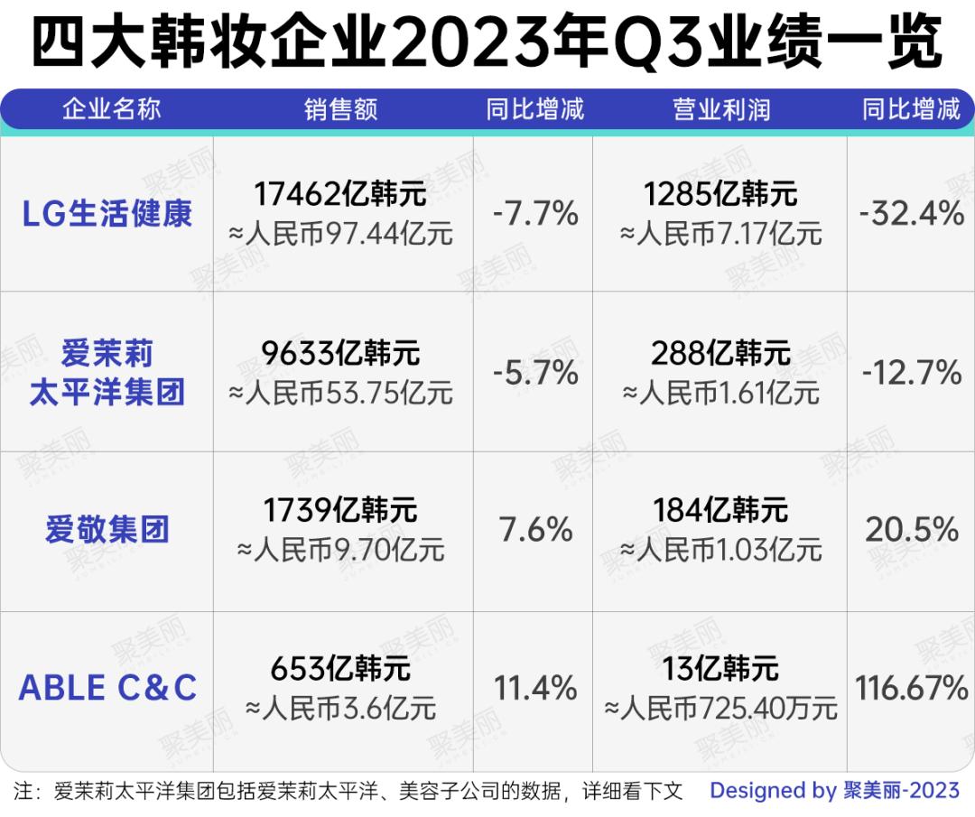 与上述两家韩妆企业不同的是,爱敬集团及谜尚母公司ABLE C&C的业绩在2023年Q3仍在增长。不过相同的都是在华碰壁,其中ABLE C&C前三季度在中国销售额持续下滑,仅千万元级别。