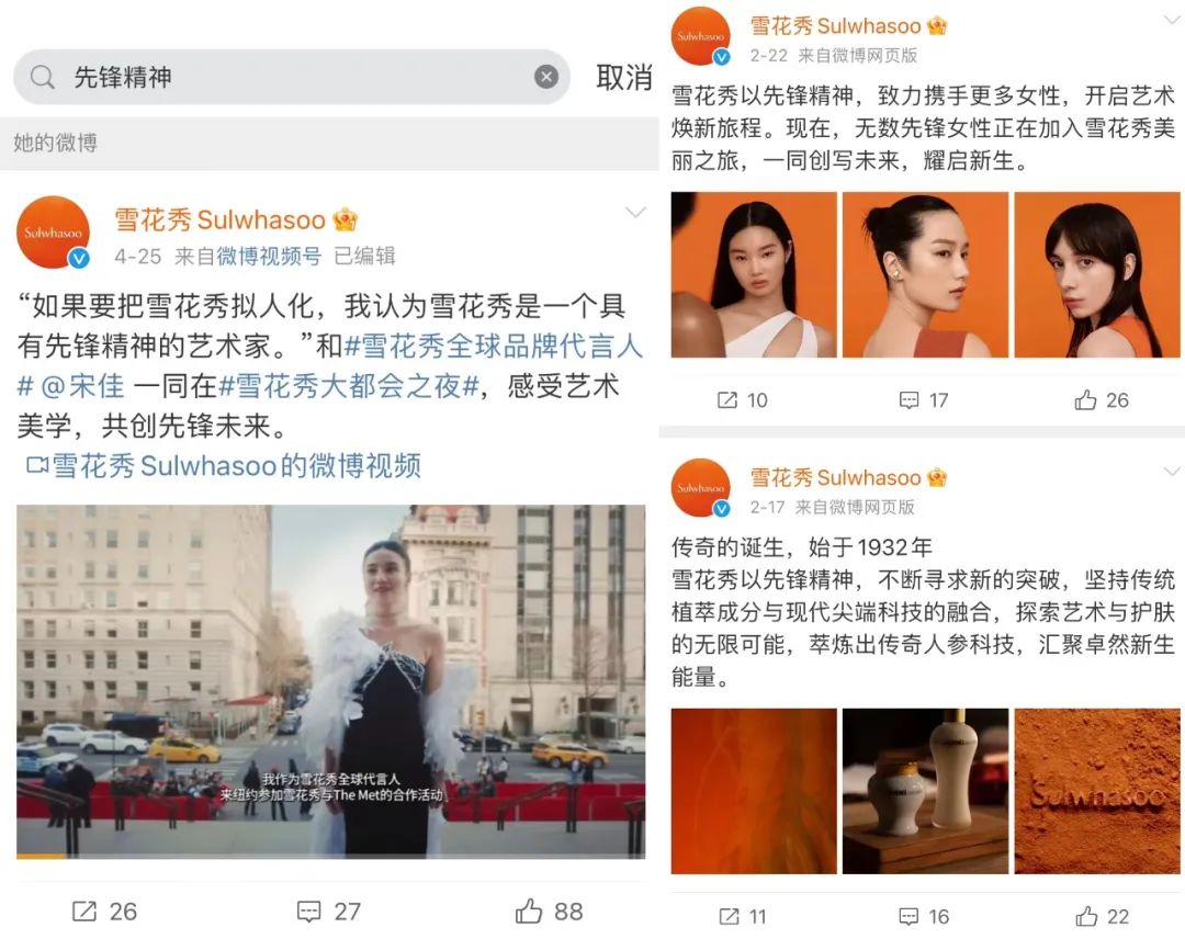 据悉,雪花秀今年在微博上发布的文案中,多次提及其以先锋精神,在产品端不断寻求新突破,并且还与不同先锋女性合作拍摄宣传照片,展现女性力量、女性之美。