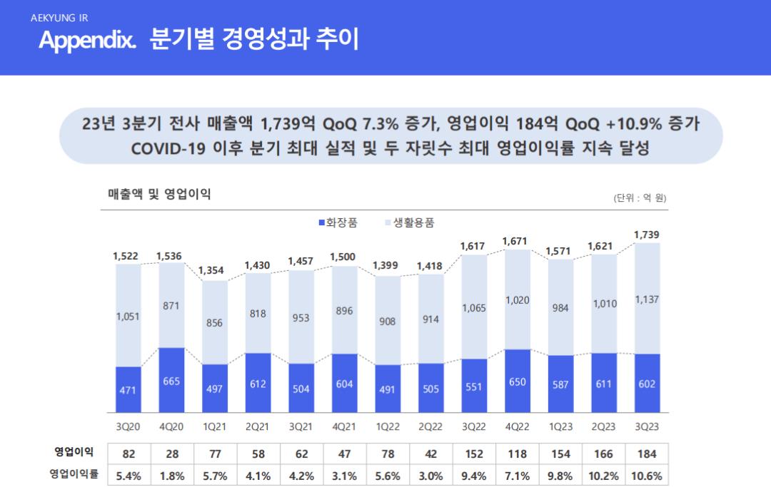 财报显示,爱敬集团2023年Q3销售额为1739亿韩元(约合人民币9.70亿元),同比增长7.6%;营业利润为184亿韩元(约合人民币1.03亿元),同比上涨20.5%,该季度销售额、营业利润均为近13个季度以来最高。