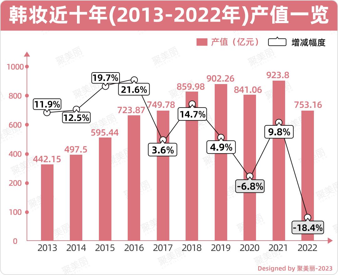 从近十年的年产值来看,2022年韩妆年产值已经跌至753.16亿元。