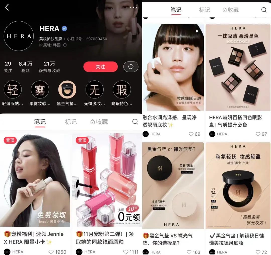 以HERA赫妍为例,可以发现其每一次的现象级爆火都是源自代言人,在中国区也曾签约过肖战、王鹤棣。但是,在营销背后,HERA赫妍并未有很好地传递品牌价值,在其小红书官方账号上也只是一些较为简单的品牌种草笔记,目前仅有6.4万粉丝,而珀莱雅等国货已有19.9万粉丝。