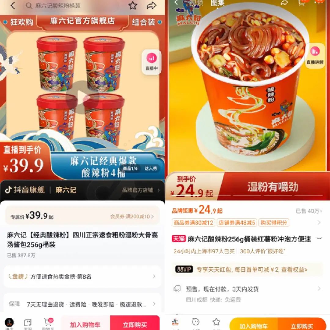旗下“王牌产品”酸辣粉的抖音销量超过387万,淘宝销量超过40万,但这款产品的源头生产工厂并非麻六记本身。