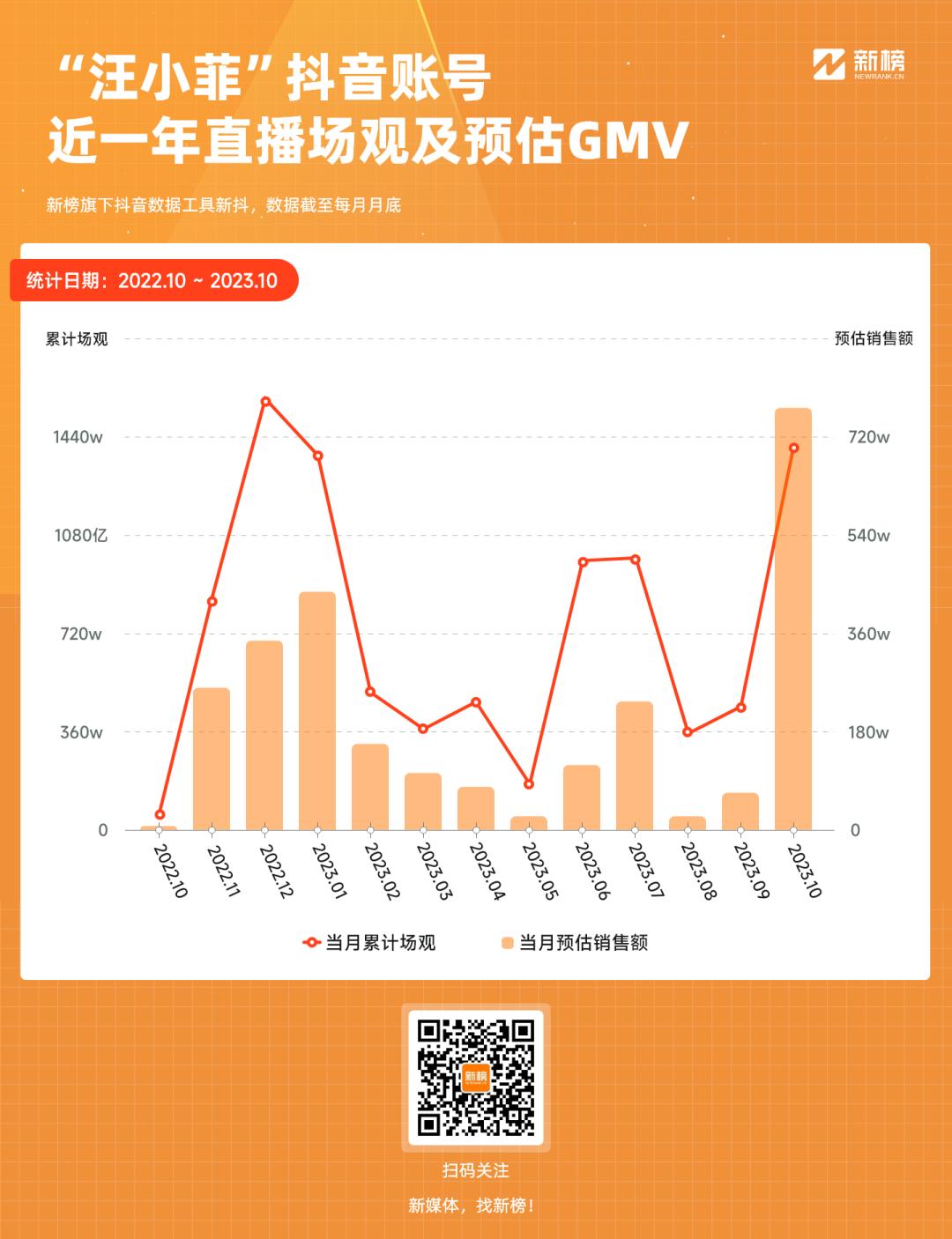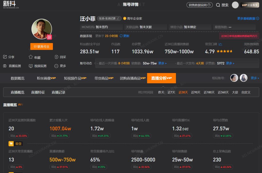 新抖数据显示,“汪小菲”近一个月直播累计场观超千万,预估带货GMV在500万至750万元。