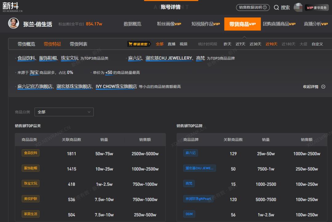 近半年来,麻六记虽然占据张兰抖音直播间的产品销量的“半壁江山”,但“张兰·俏生活”已经成长为一个全品类直播间。