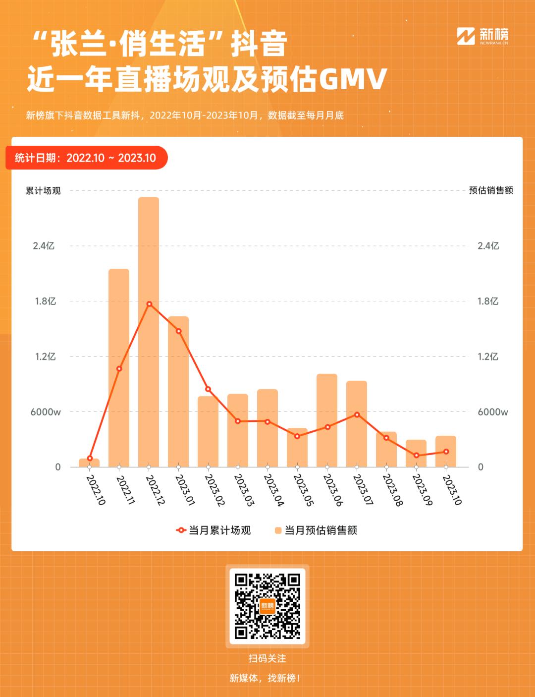 新抖数据显示,2022年12月,“张兰·俏生活”单月监测到100场直播,累计场观超近3亿次,预估销售额达1.79亿元,达到了近一年来的最高峰。