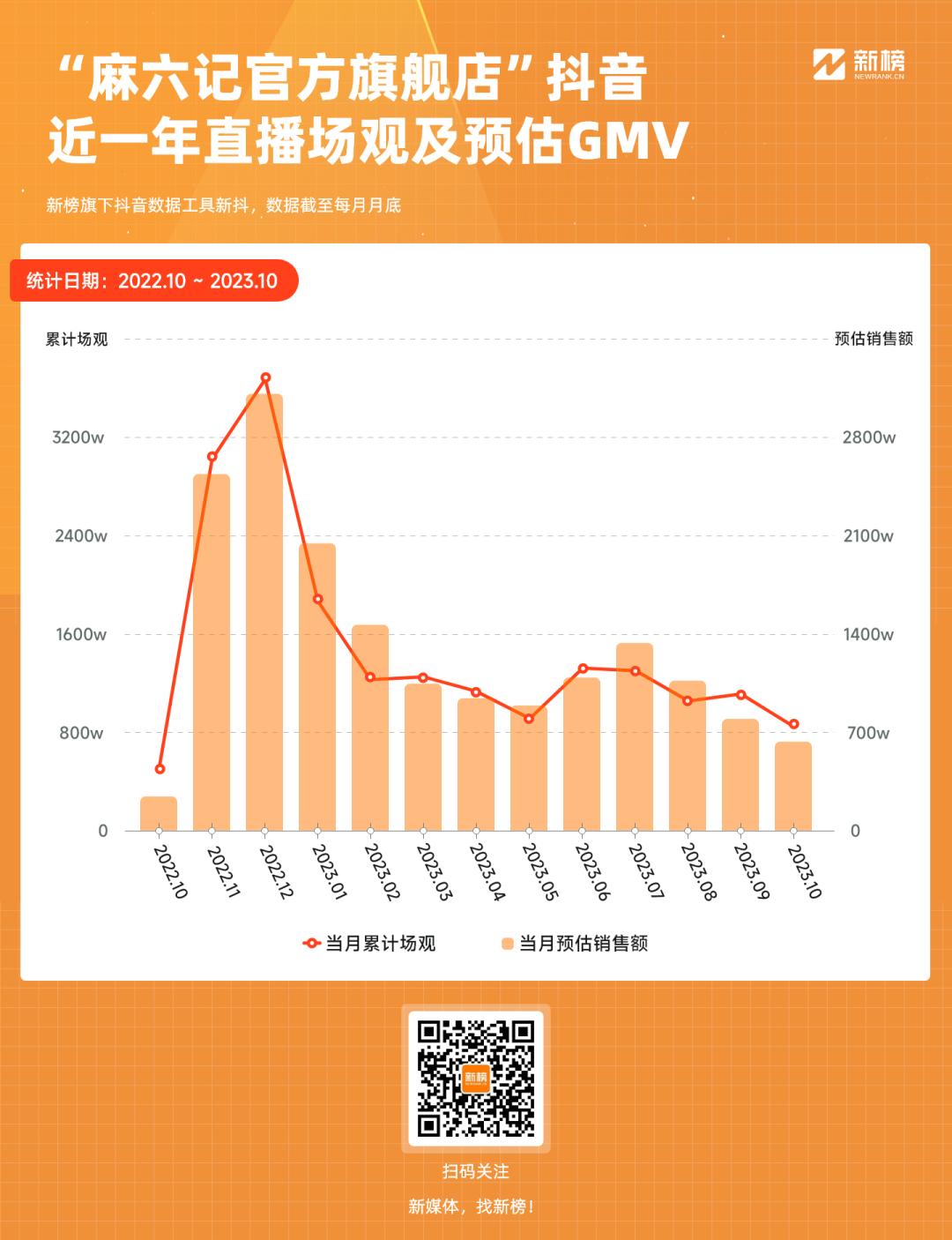 今年来,虽然麻六记官方账号流量有所回落,但近半年来的单月场观和销售额依然在千万级,远高于走红前的百万级水平。