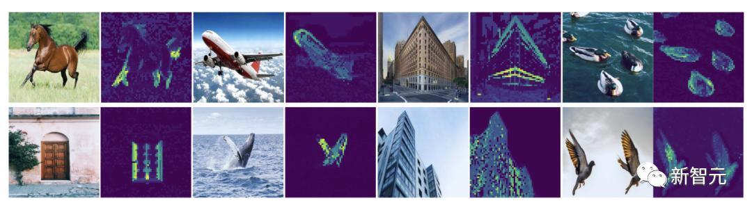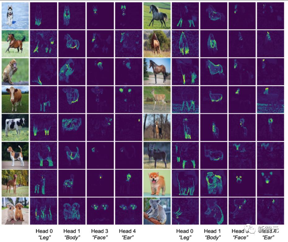 下面,研究人员将一些注意力头在几张图中的几种动物上的输出进行了可视化,显示了注意力头对应于动物的不同部分。而且结果表明,这种对应关系在不同动物的图片以及不同类别的动物图片中都是一致的。