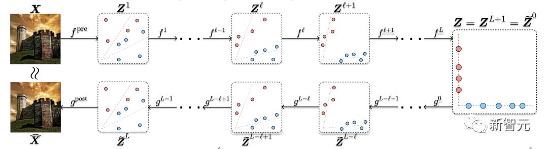 研究人员通过对稀疏率降低的展开优化来推导编码器架构。优化稀疏率降低的表征ƒ是压缩和稀疏的,如下图所示,研究人员将它们描述为由编码器ƒ实现: