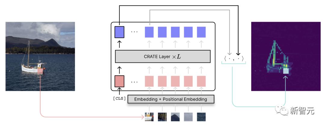 CRATE的一个有趣现象是,即使在监督分类方面进行训练,它也会学习对输入图像进行分割,并且这种分割可以通过注意力图轻松恢复,如下面的流程(类似于 DINO)。
