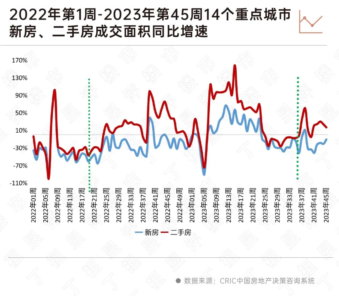 从周度数据来看,2023年第37周(9.4-9.10),也就是一线城市纷纷落地“认房不认贷”之后,各城市迎来一波政策放松潮,自此开始,重点城市二手房成交同比增速进入正增长通道,并且一直延续到了第45周(10.30-11.05)。